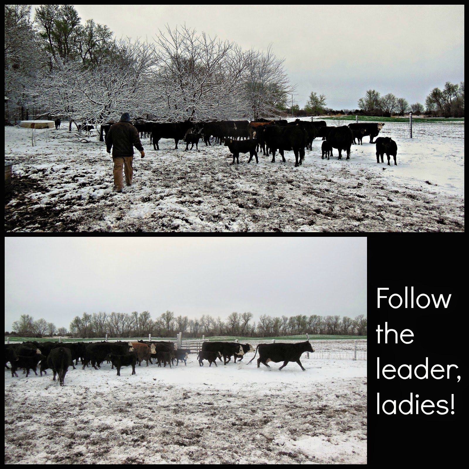 Because of their earlier shenanigans of repeatedly ignoring the electric fence and going for several unsanctioned strolls to the wheat field, it was time to move the cow-calf pairs at the round top. When we woke up to a couple inches of snow Monday morning, I campaigned with the Farmer that perhaps this job could be done on a different day. It was to no avail. And with good reason: When the guys got the 4-wheeler out of the trailer, the cows again departed for the wheat field.